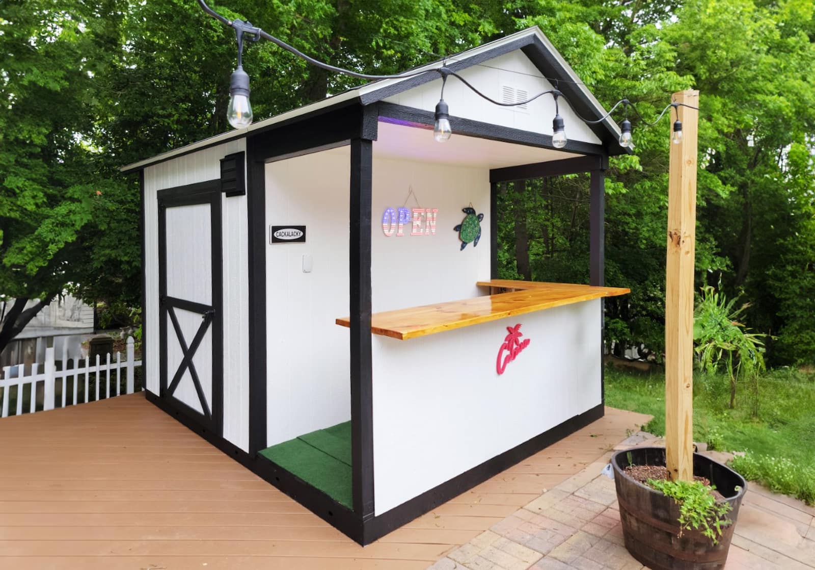 Speaking of backyard bars, Scott wanted both storage and a place to sling drinks outdoors. He came up with the mullet shed: party in the front, storage in the back.