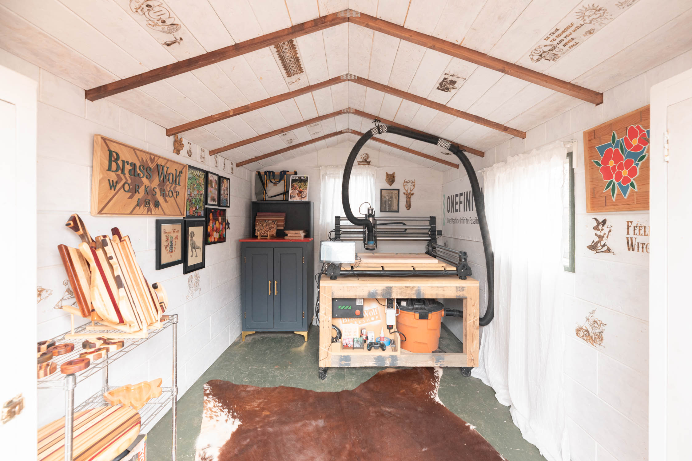 Jen and Remus converted their 8 x 12 SR-600 building into their CNC room, so they could continue to create and expand their business. They insulated the building and used custom OSB panels to finish it out. Plus, they refurbished and installed used cabinets to house woodworking tools and accessories.